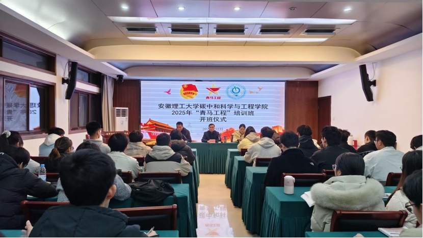 为深入学习贯彻习近平新时代中国特色社会主义思想,培养一批信仰坚定、能力突出、作风过硬的青年骨干力量,12月22日晚,安徽理工大学碳中和科学与工程学院2025年“青马工程”培训班开班仪式在明德楼第二会议室举行。学院党委书记武书记出席仪式,学院团委副书记邓礼瑞主持仪式,近80名入党积极分子、学生干部齐聚一堂,共同开启青马培训的学习征程。